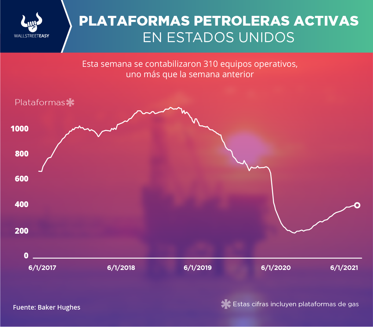 De acuerdo con información de Baker Hughes, actualmente en EEUU se encuentran 403 equipos activos (incluyendo los de gas). En la actividad petrolera se contabilizaron 310, uno más que la semana anterior. En las operaciones de gas hay 92 equipos operativos, mismo número que hace siete días. Hace un año estaban activas 793 plataformas.