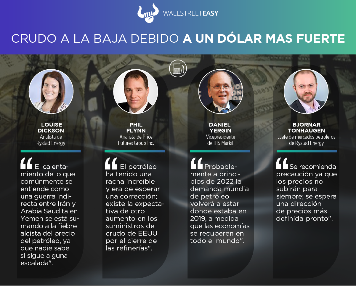 Los precios del crudo empezaron la semana a la baja, debido al fin de los temores de interrupción del suministro de Arabia Saudita tras un ataque a sus instalaciones, y por un dólar estadounidense más fuerte. Sin embargo, los analistas creen que una corrección en el precio era inevitable, y que para 2022 la demanda podría volver a niveles de 2019. Nuevo rango esperado es de $59 – $67.