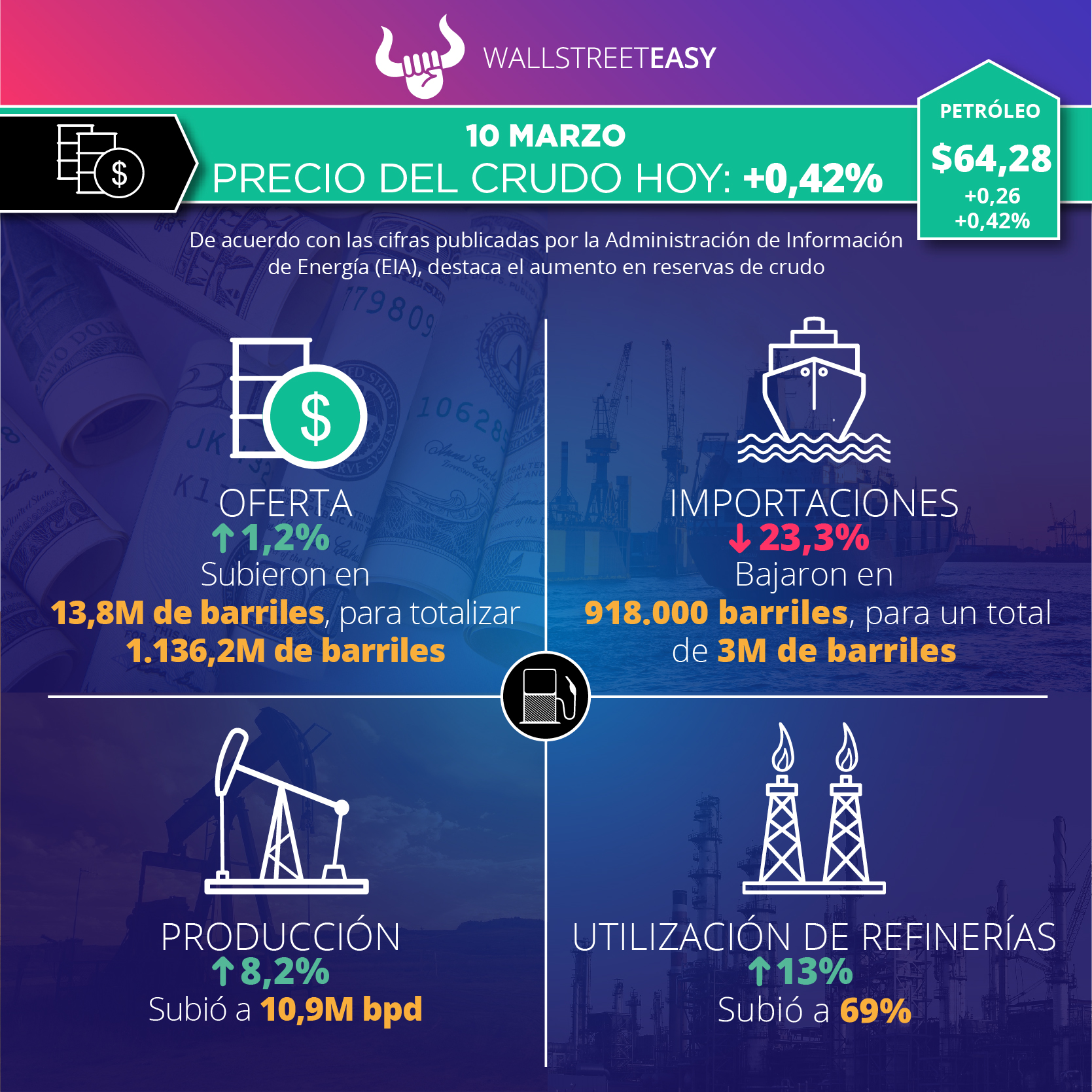 Al cierre de esta edición, el precio del barril subió hasta $64,28, lo que representa +0,42% en comparación con el día martes.