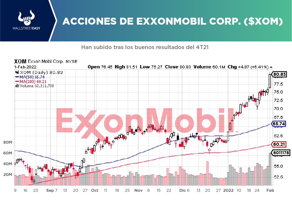 La petrolera informó ayer ganancias en el 4T21 de $8.900M, o $2,08 por acción, lo que supone unas ganancias para todo el año de $23.000M, o $5,39 por acción. El beneficio por acción se situó en $2,05, por encima de la previsión de $1,94 por acción del consenso de The Wall Street Journal.