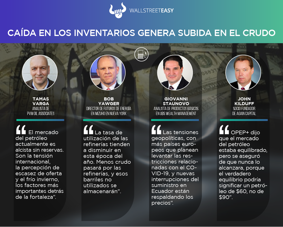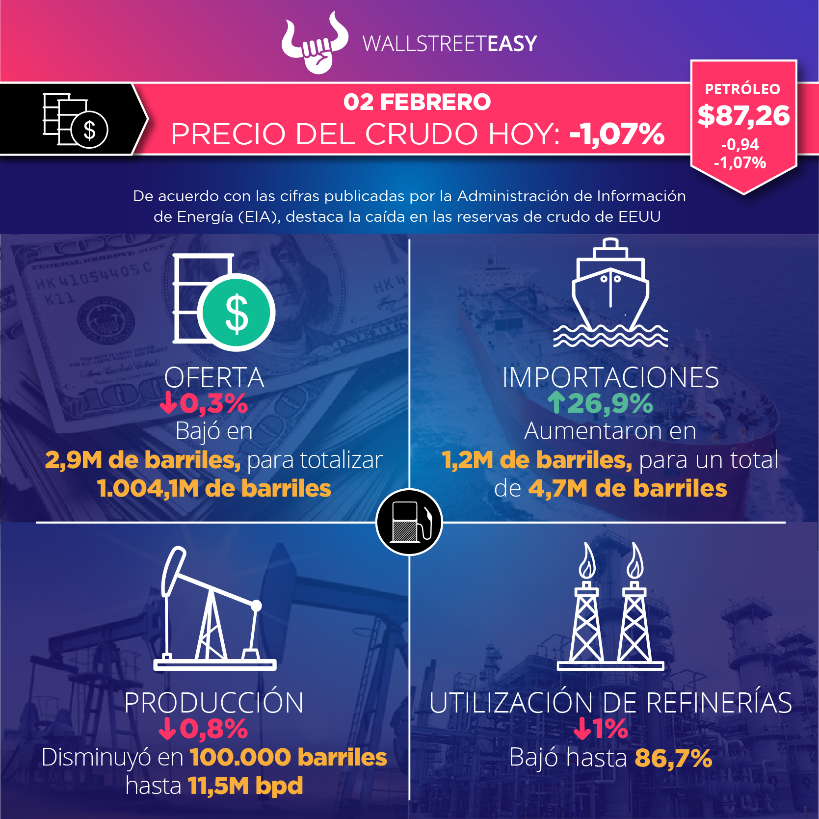 La Administración de Información de Energía (EIA, por sus siglas en inglés) reportó 1.004,1M de barriles en existencias de crudo, tanto comerciales como estratégicas, lo que representa una baja de 2,9M de barriles. El Instituto Americano del Petróleo (API, por sus siglas en inglés) había estimado una baja de 1,6M de barriles. A continuación, otros datos relevantes del informe: