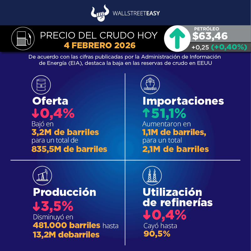 EIA, por sus siglas en inglés) reportó 1.061M de barriles en existencias de crudo, tanto comerciales como estratégicas, lo que representa un aumento de 2,1M de barriles. El Instituto Americano del Petróleo (