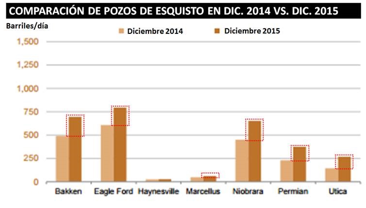 Las noticias que llegan desde el norte complican aún más el panorama para los que apuestan a esta materia prima. En todos los “shales wells” -o pozos de esquisto- hemos visto un incremento importante de la producción, a pesar de la caída en el número de plataformas petroleras, por lo que podemos suponer que la tendencia se extiende a todo el territorio de los Estados Unidos, y no solo a algunos pozos. Fíjense a continuación: