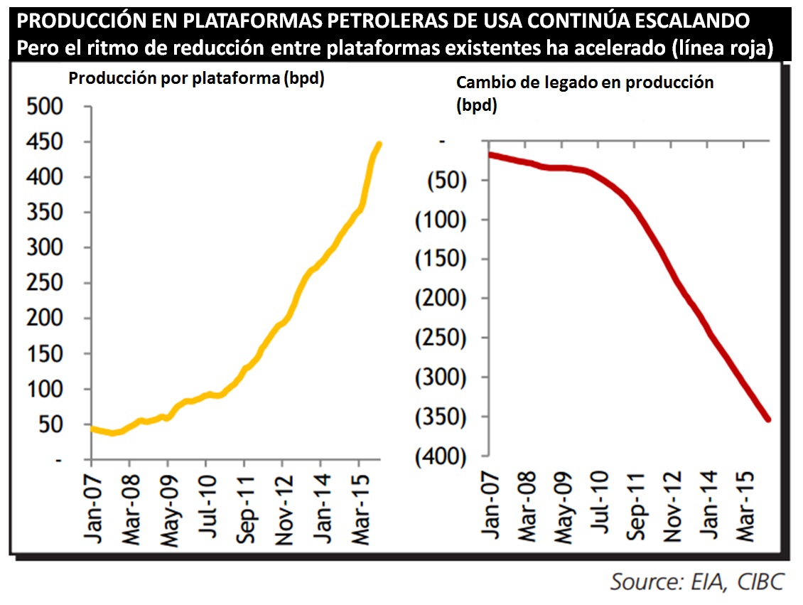 Viendo el vaso medio lleno, la Agencia de Energía (AIE) espera que este incremento en la oferta no continuará en 2016. Ante un barril abaratado, las empresas petroleras no disponen de nuevo capital para invertir en actualizar su tecnología. En consecuencia, Qué Bolsa prevé que la línea amarilla de producción por plataforma no es sostenible.