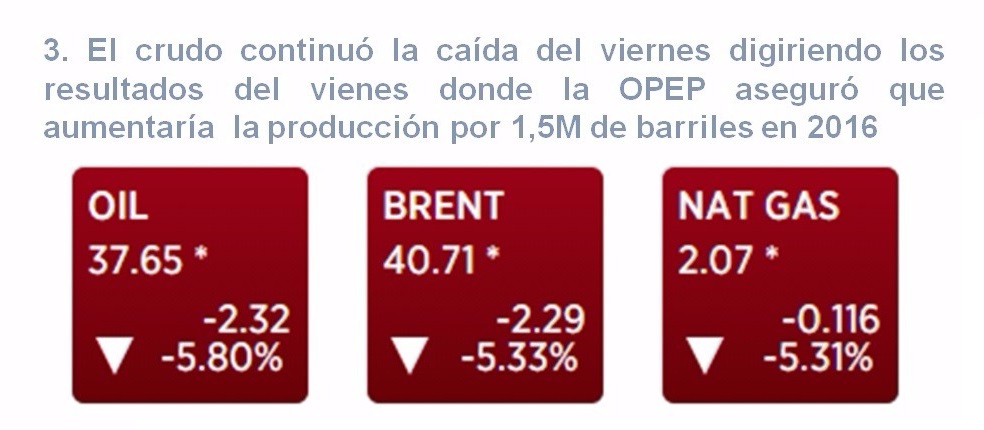 La decisión de la OPEP de incluso elevar las cuotas de producción hasta 1.5M de barriles en 2016, desencadenó una venta masiva que hizo llegar el crudo a niveles de 2009 este lunes. En la bolsa, el crudo cayó –5,8% ayer, mientras que el sector energía rodó –4,5%. Esto asustó a los mercados por el riesgo de deflación y posible ola de empresas energéticas que podrían caer en bancarrota. La caída del barril dominó las noticias y tumbó las bolsas mundiales.