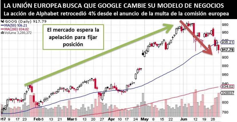 El martes 27 de junio, la Comisión Europea multó a Google con €2,42 millardos ($2,7 millardos) tras considerar que Alphabet (GOOG) viola la ley antimonopolio.