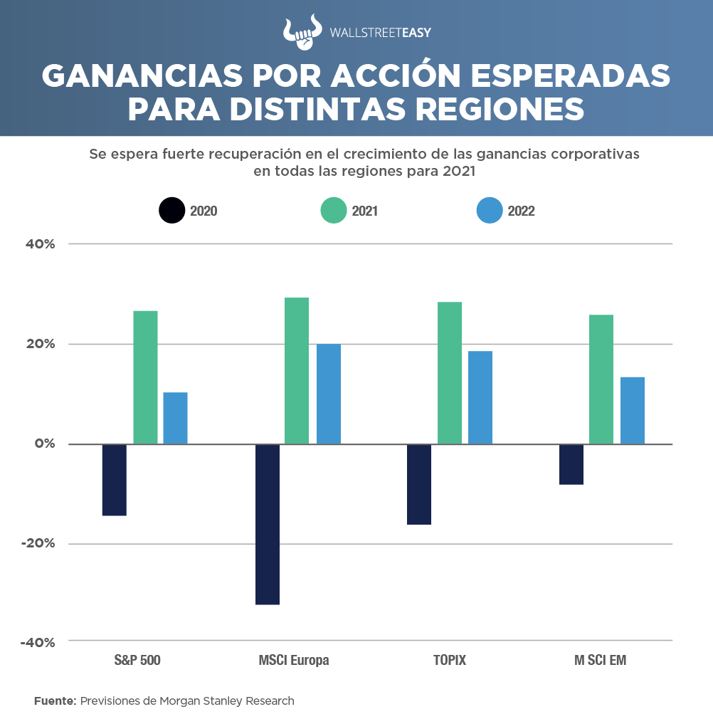 Según Morgan Stanley, hay puntos clave de las perspectivas de inversión para 2021, una de ellas es que las ganancias globales parecen estar listas para aumentar. Ciertamente, hace un año los estrategas de la institución esperaban un contexto económico de final de ciclo por lo que las expectativas de ganancias eran bajas.