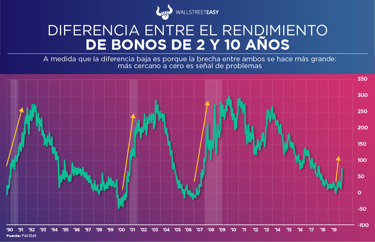 Una curva de rendimiento invertida precede a una recesión, pero en realidad, lo que se espera es que el diferencial vuelva a ampliarse. Por lo general, una aceleración de la Reserva Federal (FED) nos da una inclinación alcista que puede indicar problemas y la inversión puede ser muchos meses (incluso años) antes.