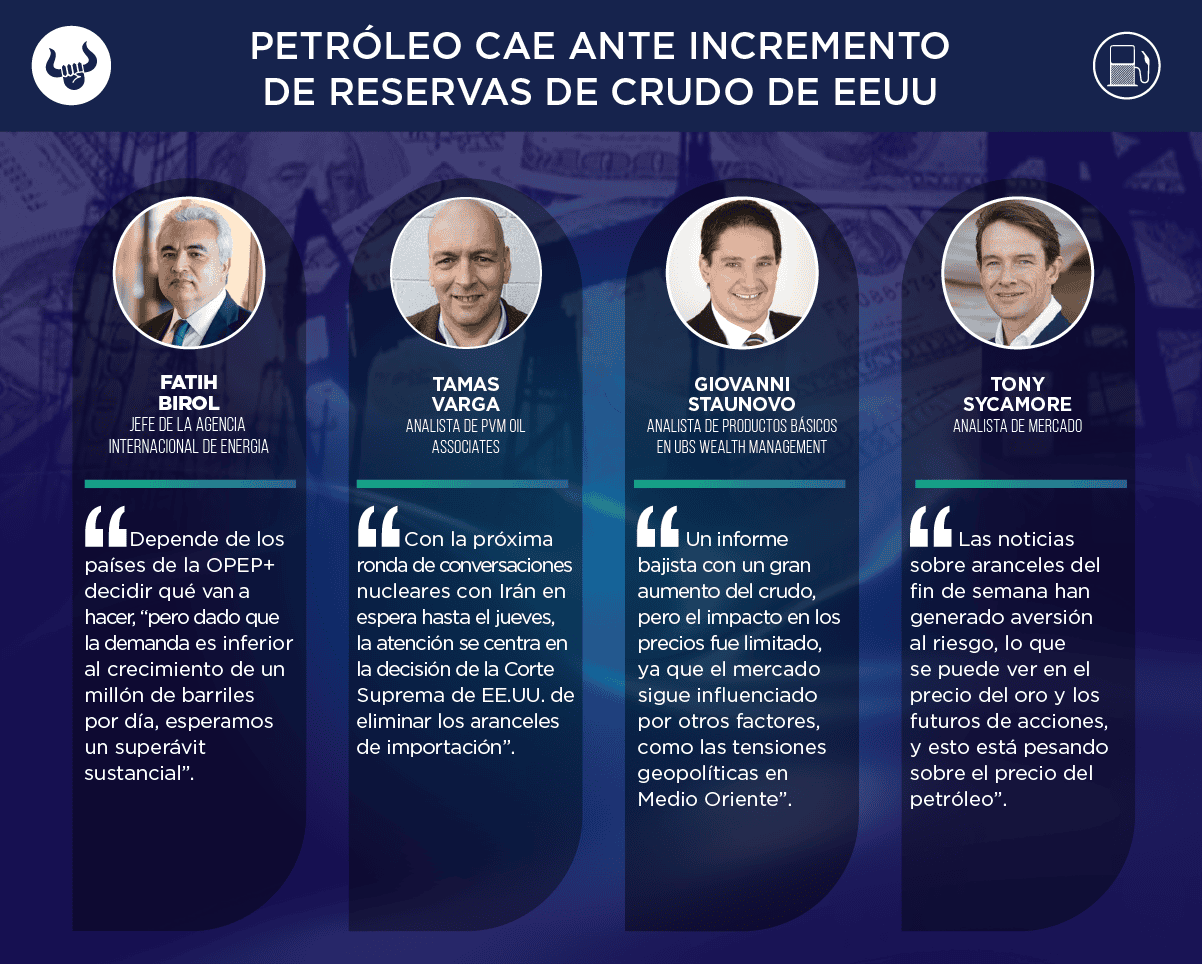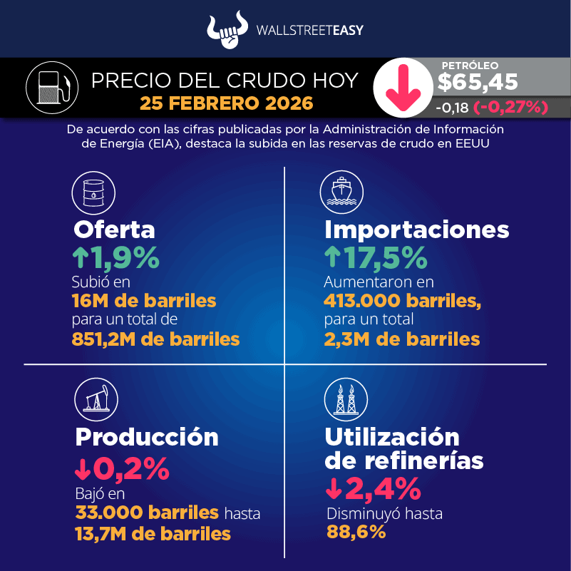 EIA, por sus siglas en inglés) reportó 851,2M de barriles en existencias de crudo, tanto comerciales como estratégicas, lo que representa un aumento de 16M de barriles. El Instituto Americano del Petróleo (