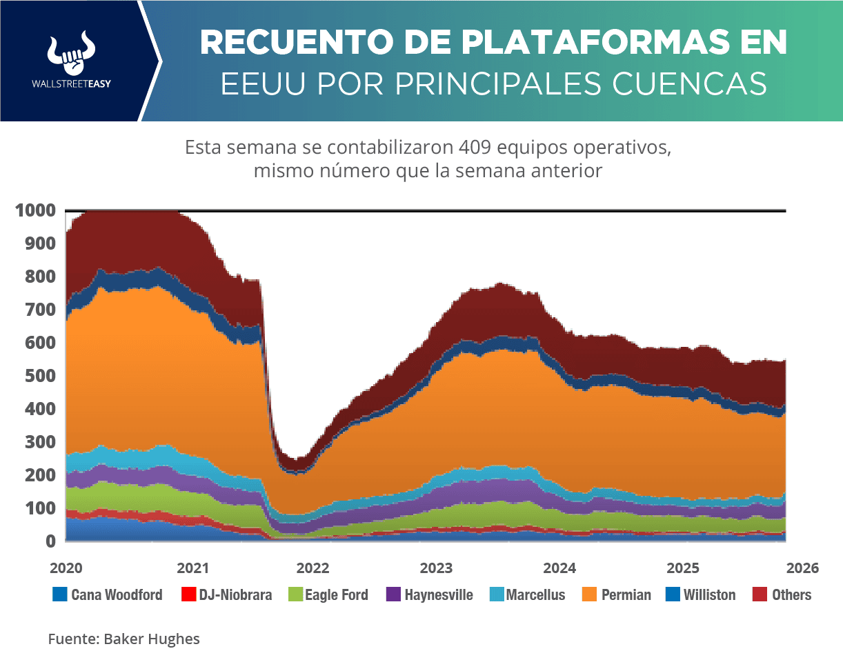 Baker Hughes, actualmente en EEUU se encuentran 551 equipos activos (incluyendo los de gas). En la actividad petrolera se contabilizaron 409, mismo número que la semana anterior. En las operaciones de gas hay 133 equipos operativos, sin cambios desde hace siete días. Hace un año estaban activas 588 plataformas.