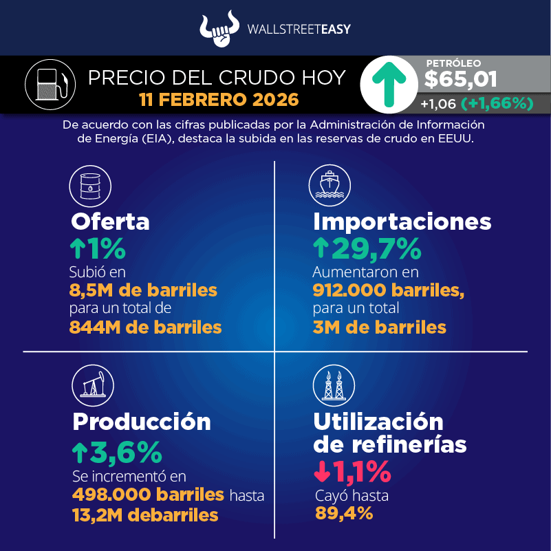 EIA, por sus siglas en inglés) reportó 835,5M de barriles en existencias de crudo, tanto comerciales como estratégicas, lo que representa un aumento de 8,5M de barriles. El Instituto Americano del Petróleo (