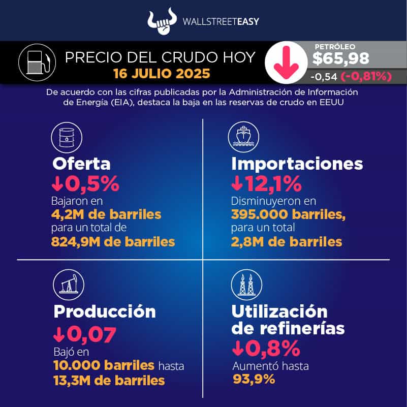 EIA, por sus siglas en inglés) reportó 824,9M de barriles en existencias de crudo, tanto comerciales como estratégicas, lo que representa una baja de 4,2M de barriles. El Instituto Americano del Petróleo (