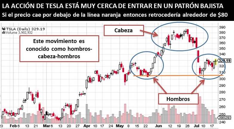 Aunque el martes 18 de julio la acción de Tesla (TSLA) se recuperaba de una pequeña caída ocasionada por un comentario de su CEO, la acción se encuentra aún en peligro de formar un patrón de head and shoulders (hombro–cabeza–hombro).