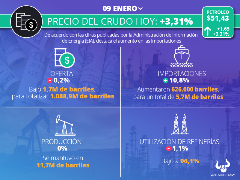 • Al cierre de esta edición, el precio del barril bajó hasta $51,43, lo que representa +3,31% en comparación con el día martes.