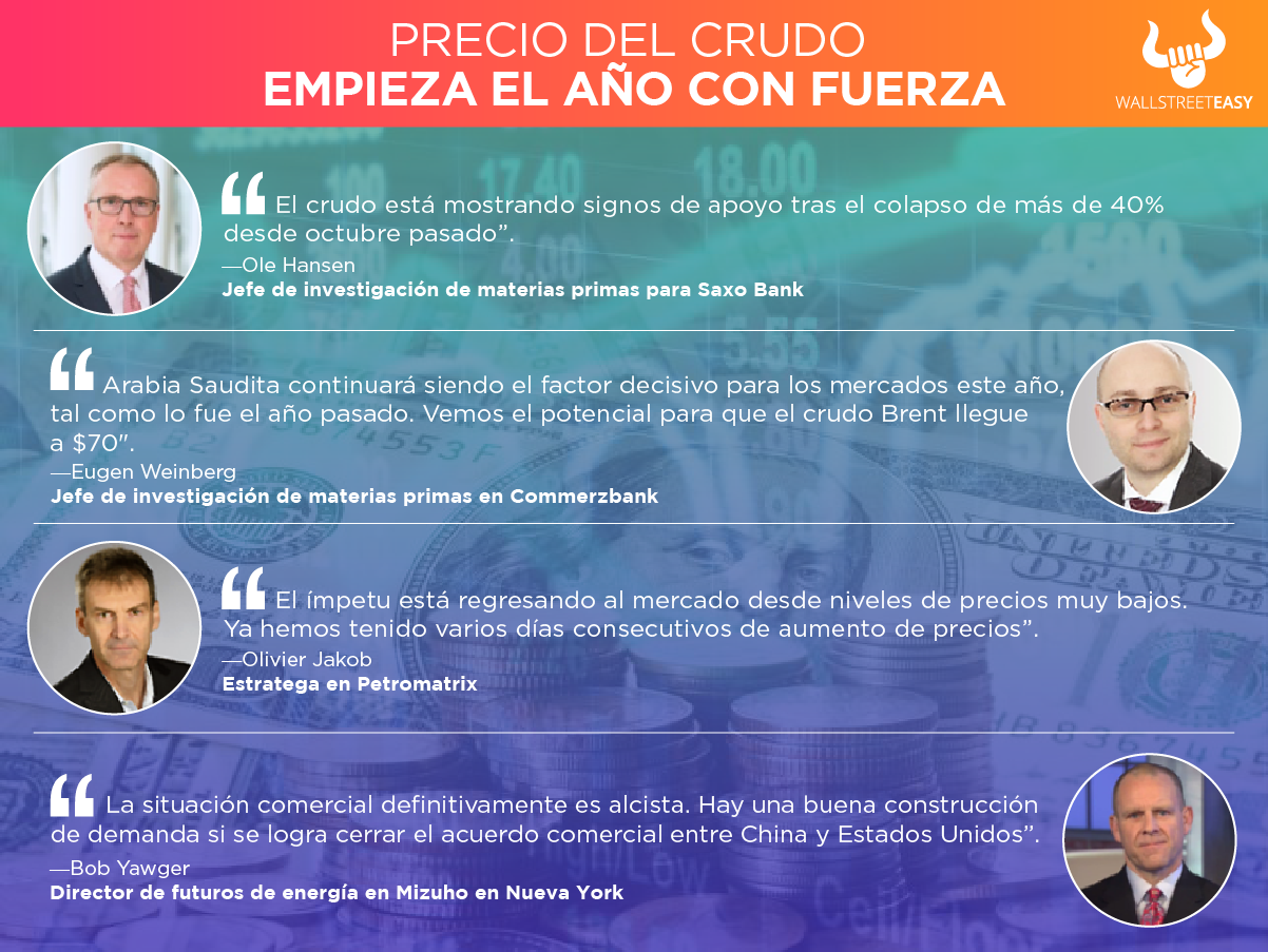 Las expectativas de menores tensiones entre China y EEUU ante el inicio de la conversaciones entre ambas naciones, junto con los recortes de la OPEP, ha generado que el crudo tenga el rally más largo en 17 meses. Ante esto, el mercado está optimista de tener un mejor año de lo que fue 2018. Nuevo rango esperado de precio es de $44-$50.