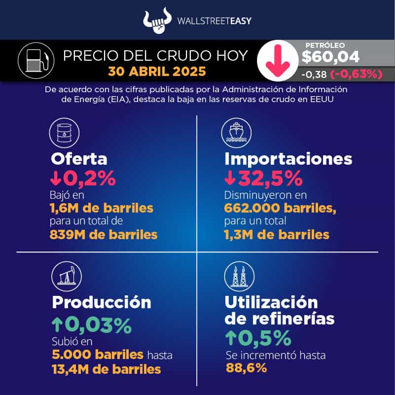 EIA, por sus siglas en inglés) reportó 839M de barriles en existencias de crudo, tanto comerciales como estratégicas, lo que representa una baja de 1,6M de barriles. El Instituto Americano del Petróleo (