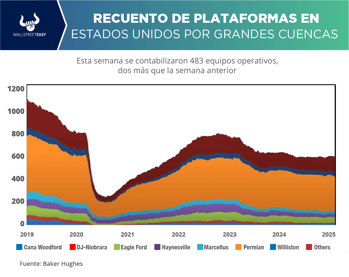 Baker Hughes, actualmente en EEUU se encuentran 587 equipos activos (incluyendo los de gas). En la actividad petrolera se contabilizaron 483, dos más que la semana anterior. En las operaciones de gas hay 99 equipos operativos, uno más que hace siete días. Hace un año estaban activas 613 plataformas.