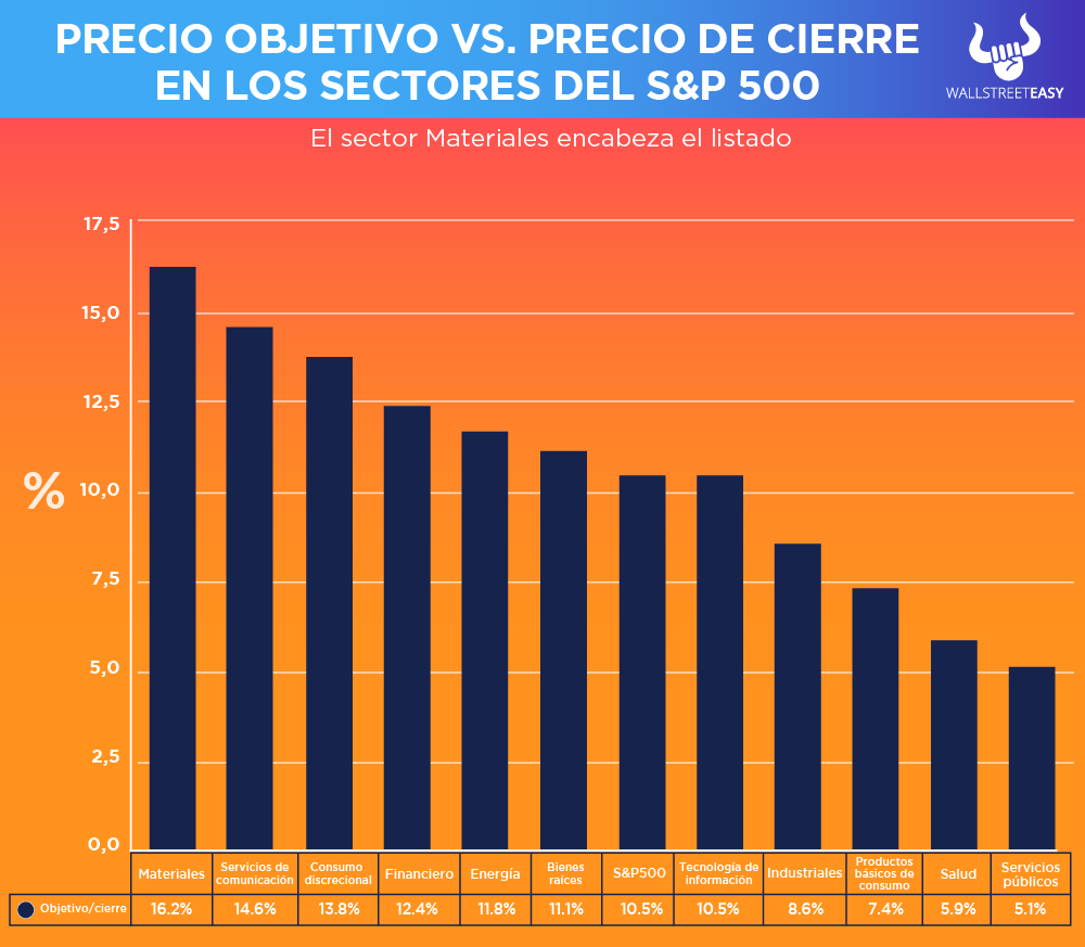 Si observamos este pronóstico más detalladamente, a nivel sectorial, vemos que los sectores en donde se espera un mayor crecimiento los próximos doce meses son Materiales (+16,2%), el recién creado Servicios de Comunicación (+14,6%) y Consumo Discrecional (+13,8%).