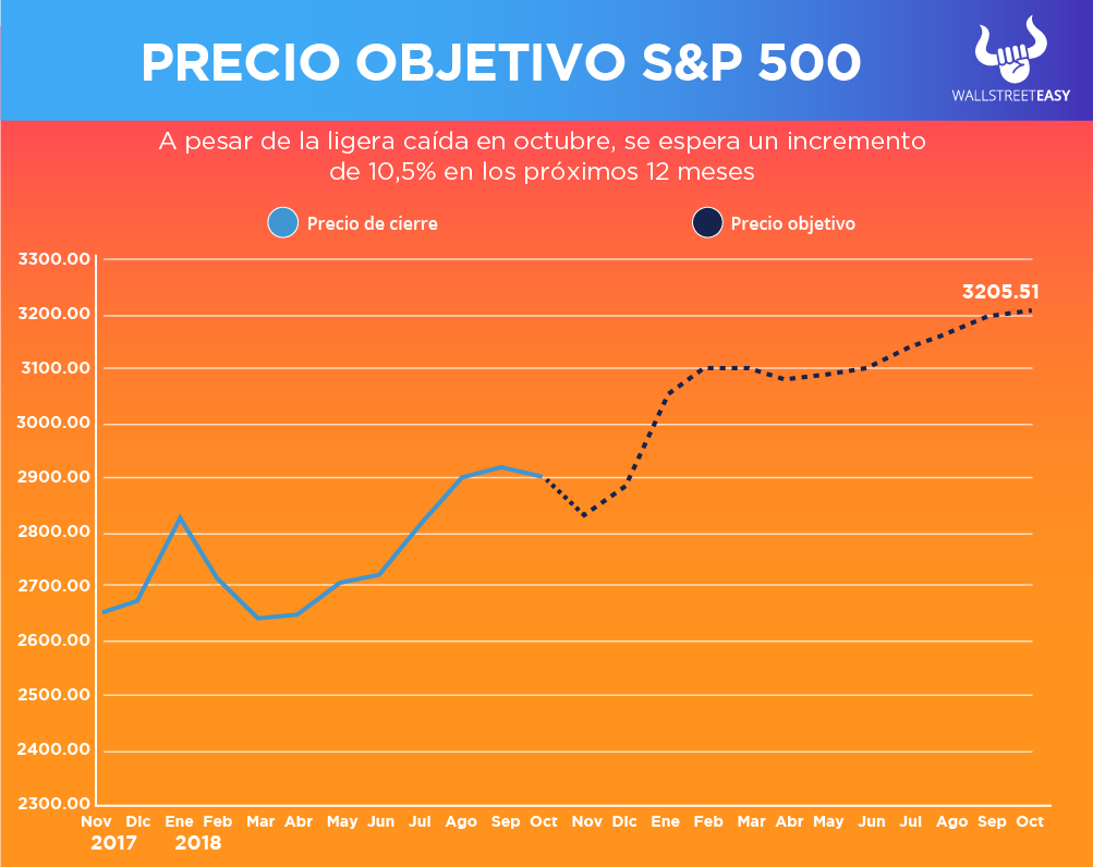 Según un estudio presentado por FactSet, los analistas del mercado pronostican que el índice de referencia del mercado bursátil estadounidense, el S&P 500, presentará un incremento de +10,5% durante los próximos 12 meses.