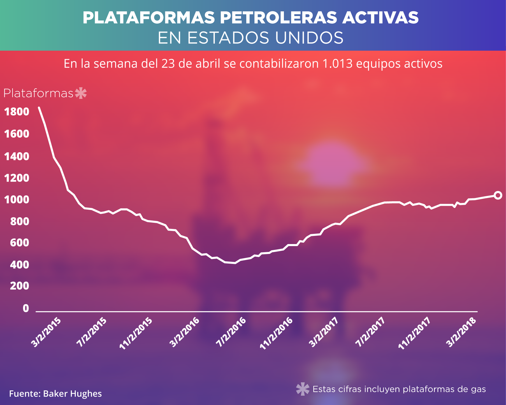 De acuerdo con información de Baker Hughes, actualmente en EEUU se encuentran 1.013 equipos activos para la actividad petrolera (se sumaron cinco), lo que representa un aumento de +0,4% en relación con la semana pasada y de +15,3% en comparación con esta fecha el año pasado.