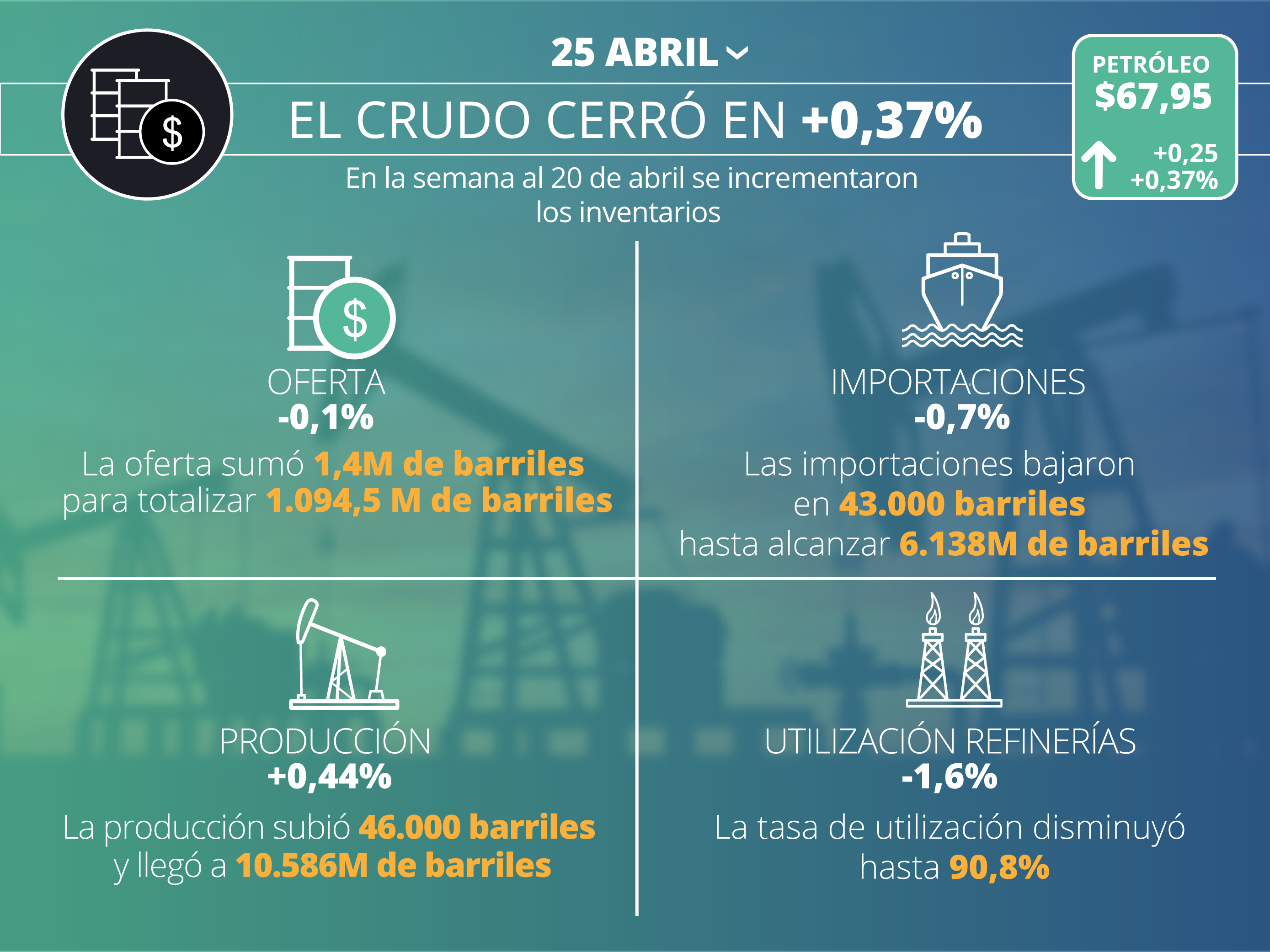 - Hoy miércoles, el precio del barril subió hasta $67,95, un aumento de +0,25% en relación al día de ayer.