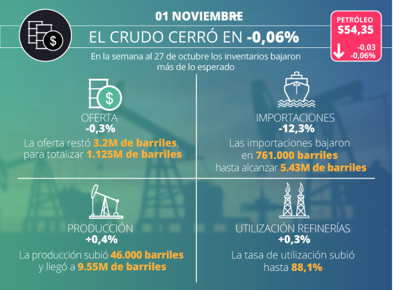La Administración de Información de Energía (EIA, por sus siglas en inglés) reportó una caída de los inventarios de 3.2M, en la semana al 27 de octubre. El consenso esperaba un declive de 1.8M de barriles y el Instituto Americano del Petróleo (API) proyectó una merma de 5.1M de barriles. Otros datos del informe: