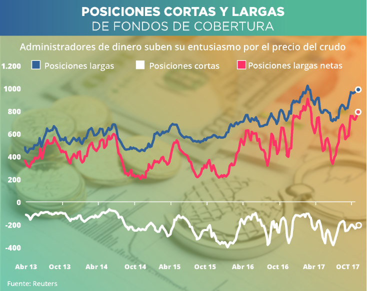Estos fondos amasaron una posición larga neta casi récord de 507M antes del 24 de octubre, cuando los precios estaban en camino a romper los $60 por primera vez desde 2015, como ya ocurrió con el Brent.