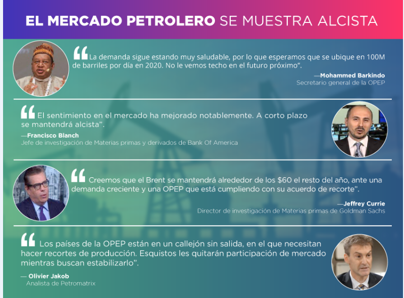 - El precio cerró el lunes en $54,15, gracias a las expectativas favorables por noticias de la OPEP. La cotización del Brent llegó a $60, cifra que no se registraba desde 2015.