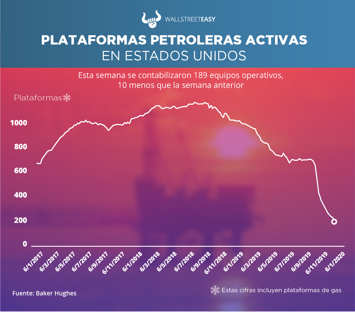 De acuerdo con información de Baker Hughes, actualmente en EEUU se encuentran 266 equipos activos (incluyendo los de gas). En la actividad petrolera se contabilizaron 189, 10 menos que la semana anterior. En las operaciones de gas hay 75 equipos operativos, tres menos que hace siete días. Hace un año estaban activas 967 plataformas.