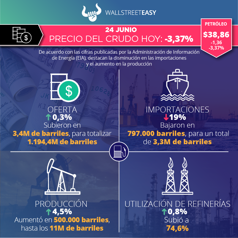 Al cierre de esta edición, el precio del barril bajó hasta $38,86, lo que representa –3,37% en comparación con el día martes.