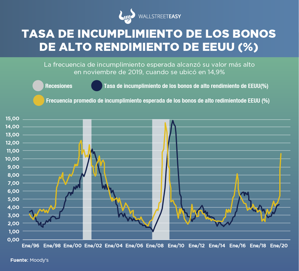 Con un mercado accionario débil y las empresas presentando pérdidas, no es sorpresa que la métrica de frecuencia de incumplimiento esperada para los bonos de alto rendimiento de EEUU haya pasado de alrededor del 4%, para finales de 2019, a ubicarse actualmente por encima del 10%, el más alto desde la crisis financiera del 2008.
