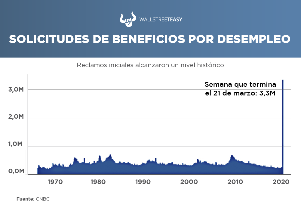 Según publicó el Departamento de Trabajo de EEUU, las solicitudes de beneficios por desempleo correspondientes a la semana pasada fueron de 3,28M, duplicando la cifra que esperaba el mercado de 1,5M, y opacando totalmente el nivel más alto de esta variable durante la crisis de 2008 (665.000), y al récord de 695.000 en octubre de 1982.
