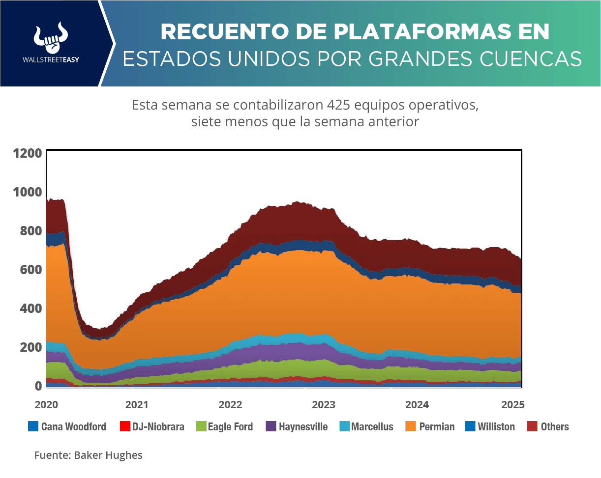 Baker Hughes, actualmente en EEUU se encuentran 539 equipos activos (incluyendo los de gas). En la actividad petrolera se contabilizaron 425, siete menos que la semana anterior. En las operaciones de gas hay 108 equipos operativos, uno menos que hace siete días. Hace un año estaban activas 585 plataformas.