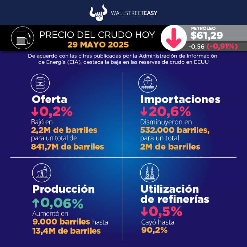 EIA, por sus siglas en inglés) reportó 841,7M de barriles en existencias de crudo, tanto comerciales como estratégicas, lo que representa una baja de 2M de barriles. El Instituto Americano del Petróleo (