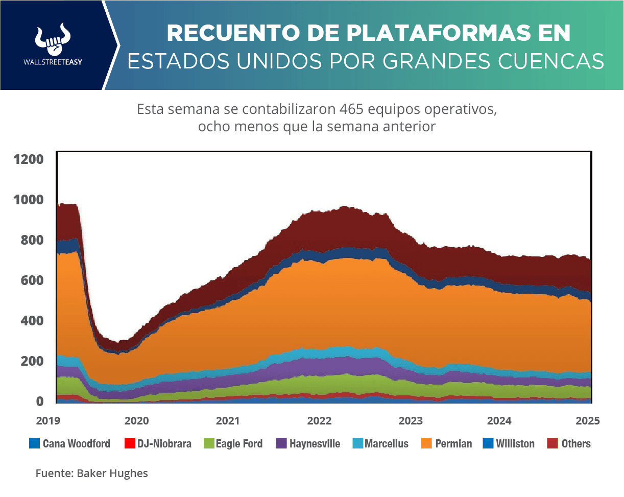 Baker Hughes, actualmente en EEUU se encuentran 566 equipos activos (incluyendo los de gas). En la actividad petrolera se contabilizaron 465, ocho menos que la semana anterior. En las operaciones de gas hay 98 equipos operativos, dos menos que hace siete días. Hace un año estaban activas 600 plataformas.