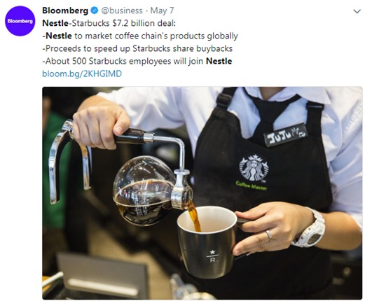 El lunes, 7 de mayo, la acción de Nestlé ($NSRGY) creció +1,38% con la noticia de que planea incluir los productos de Starbucks en su menú.