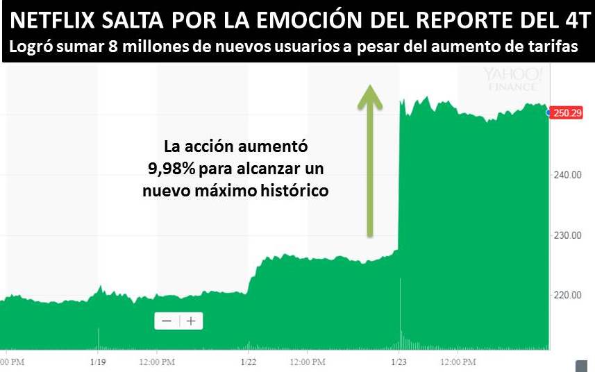 El lunes 22 de enero, la acción de la empresa de transmisión de streaming, Netflix ($NFLX) consiguió un nuevo máximo histórico tras su reporte del 4T-17, tendencia que continuó al día siguiente.