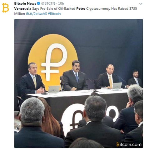 El ejecutivo dijo en su cuenta de Twitter que la criptomoneda «petro», respaldada por petróleo de Venezuela, recaudó más de $735 millones en el primer día de su preventa el martes, una cifra difícil de creer, considerando que la mayoría de los expertos y economistas ya han expresado su preocupación en torno al posible fraude que supone esta divisa digital.