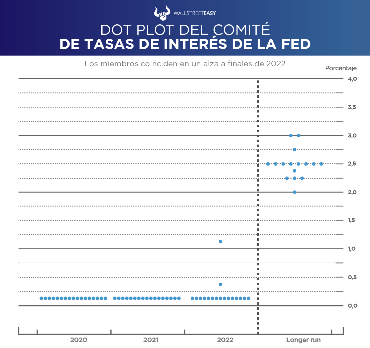 Si observamos el «dot plot», proyección que hace cada miembro del comité de Tasas de Interés de la FED en la que dejan ver sus consideraciones de movimiento de dichas tasas, indica que ninguno espera que suban ni bajen hasta finales de 2022, una noticia positiva para los mercados y que debería dar tranquilidad. Basado en que ello, no esperan que el mercado laboral tenga una mejora por debajo del 6% de inflación hasta ese año.