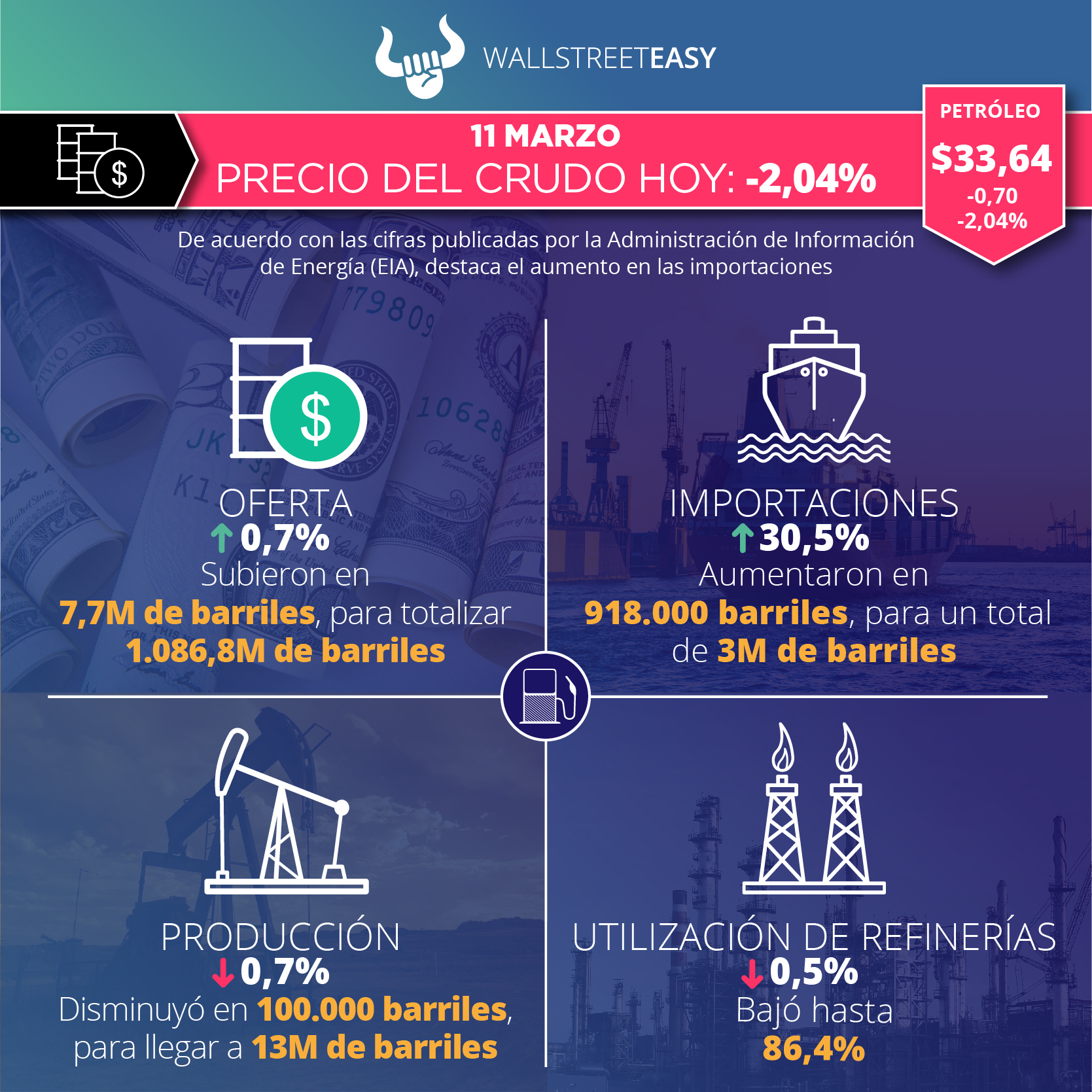 Al cierre de esta edición, el precio del barril bajó hasta $33,64, lo que representa 2,04% en comparación con el día martes.