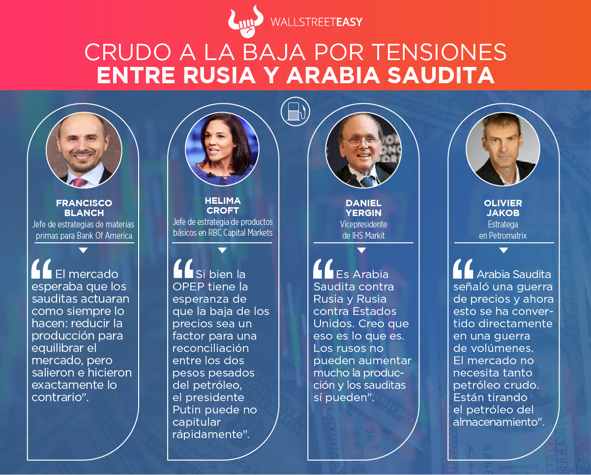 Los precios del crudo iniciaron la semana con la caída diaria más grande desde 1991. Los analistas creen que podría haber una disminución de los precios de otro 10% o más, lo que podría ser un gran golpe para el sector petrolero de EEUU. Nuevo rango esperado es de $32 – $40.