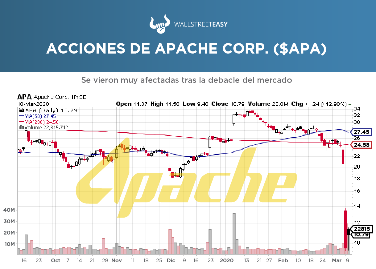 Con la caída de los precios del lunes, los productores con altos niveles de endeudamiento, como Apache, se vieron muy afectados en el mercado de valores. Por otra parte, Paul Sankey, investigador de Mizuho Americas, dijo que «la reducción de la demanda global significa que la demanda de esquisto de EEUU podría caer entre 2M y 3M bpd».