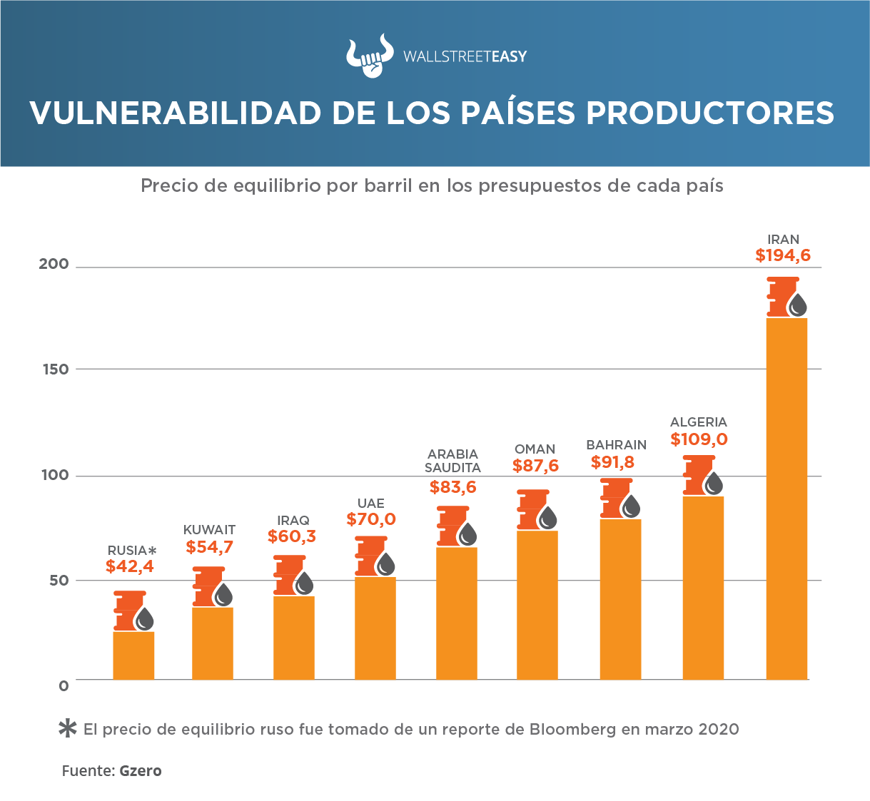 • Los precios más bajos por barril serán un dolor de cabeza para los principales países exportadores de petróleo del mundo, pero algunos son más vulnerables que otros. A continuación podemos observar el precio del petróleo que los exportadores necesitan para que sus presupuestos nacionales se mantengan equilibrados: