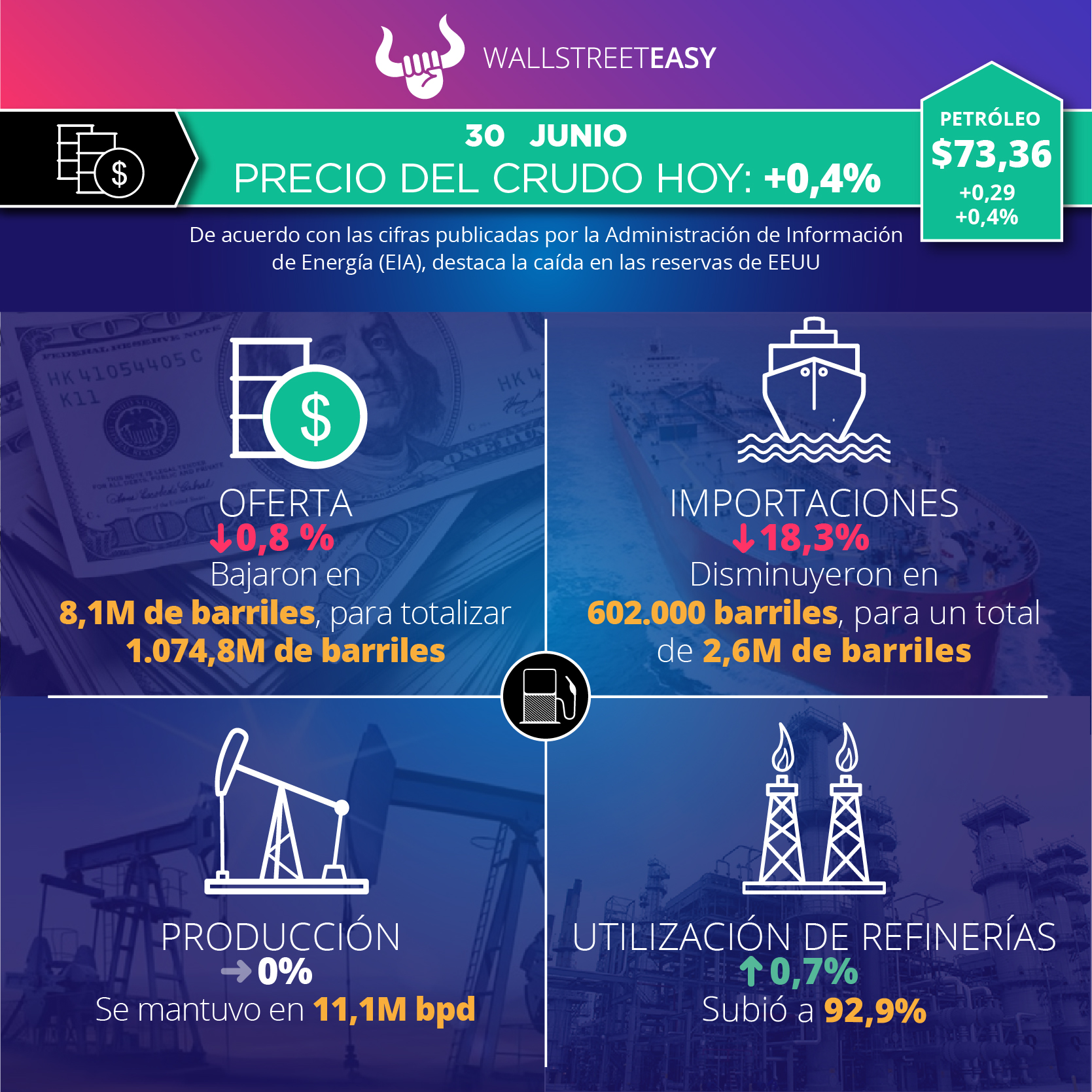 La Administración de Información de Energía (EIA, por sus siglas en inglés) reportó 1.074,8M de barriles en existencias de crudo, tanto comerciales como estratégicas, lo que representa una disminución de 8,1M de barriles. El Instituto Americano del Petróleo (API, por sus siglas en inglés) había estimado una baja de 8,1M de barriles. A continuación, otros datos relevantes del informe:
