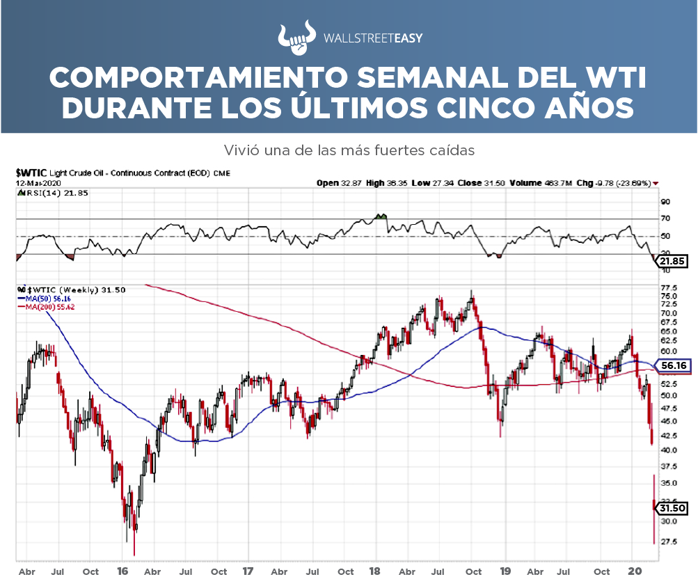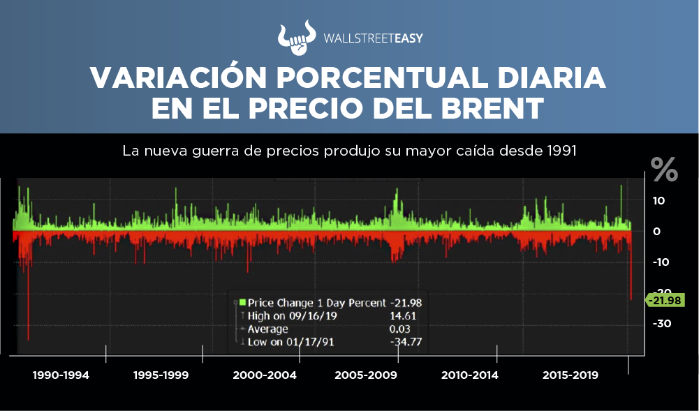El lunes 9 de marzo, debido a la falta de acuerdo entre los países de la OPEP y sus aliados generó que el West Texas Intermediate (WTI) cayera –25% a $31,13$ por barril, y que el crudo Brent perdiera –24% para cerrar en $34,36, el mayor descenso del petróleo desde la guerra del Golfo Pérsico en 1991.
