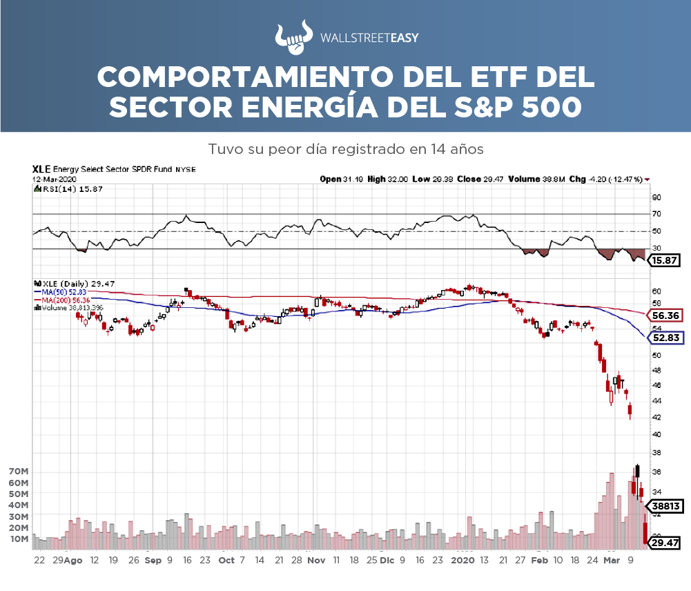 El lunes 9 de marzo, las acciones en el sector energético del S&P 500 cayeron –17%, siendo su peor día registrado en 14 años. ExxonMobil Corp. (XOM) cayó más de –14%, la mayor caída en 11 años. Las acciones de Chevron Corp. (CVX) cayeron –16%, y las de Saudi Aramco cayeron por debajo de su precio de salida a bolsa por primera vez desde que comenzaron a cotizar en diciembre.