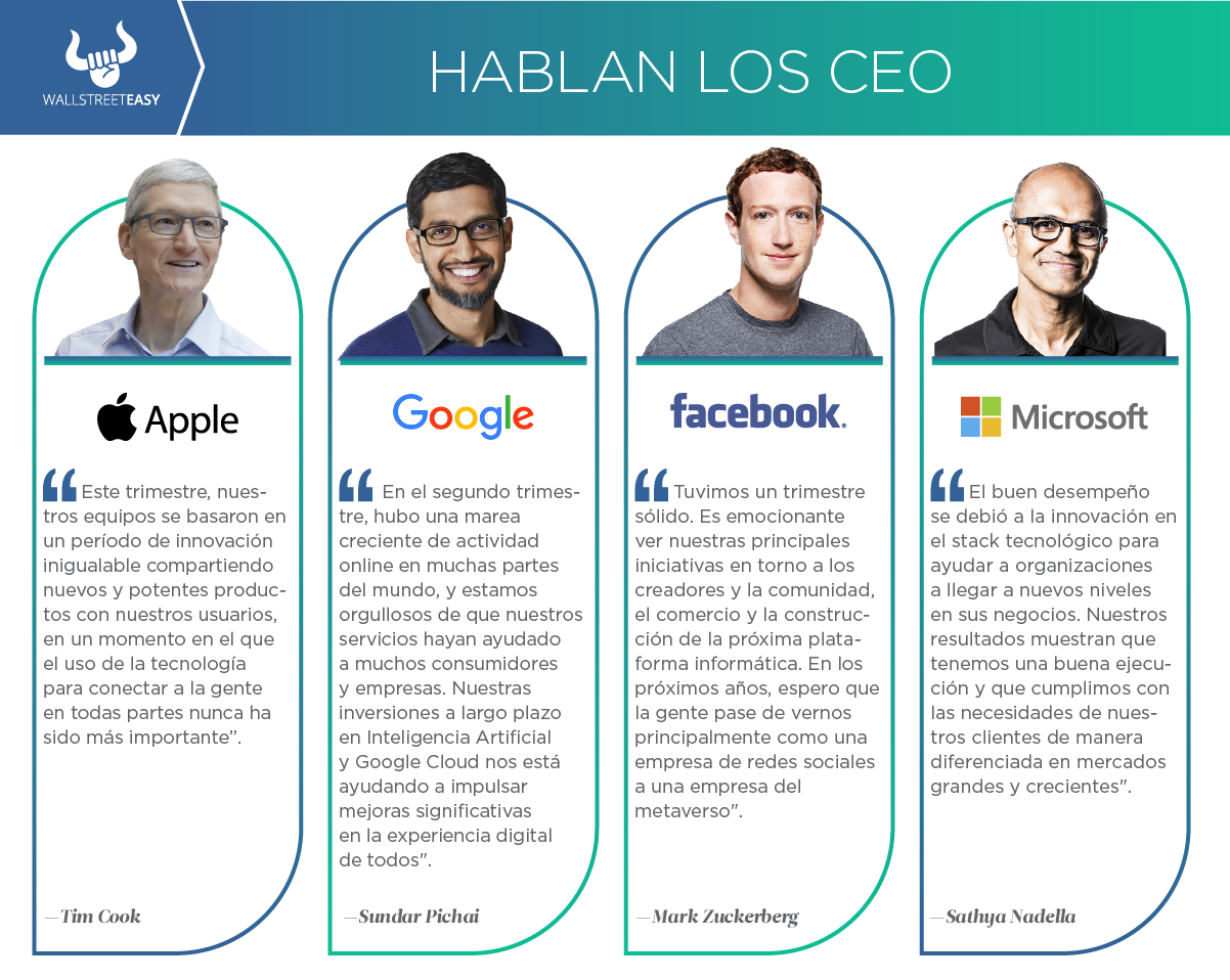 Una nueva semana de reportes de ingresos del segundo trimestre de 2021. A continuación, veremos cómo les fue a Alphabet Inc. (GOOGL); Amazon.com Inc. (AMZN); Apple Inc. (AAPL); Facebook Inc. (FB); Microsoft Corp. (MSFT) y Tesla Inc. (TSLA).
