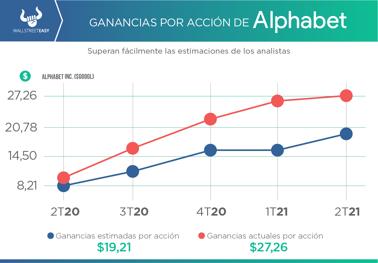 - Las ganancias por acción de $27,26 sobrepasaron las expectativas de $19,34 por acción, y los ingresos de $61.880M dejaron muy atrás las proyecciones de $56.160M. Los ingresos publicitarios de YouTube llegaron a $7.000M, pasando las estimaciones de $6.370M.