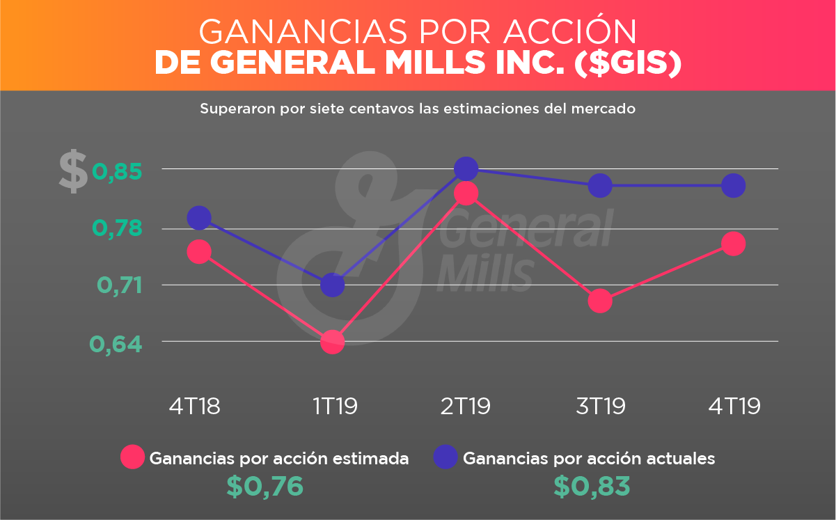 - General Mills también dio a conocer su perspectiva fiscal para el 2020: espera que las ventas netas orgánicas aumenten de 1% a 2% y las ganancias por acción ajustadas de todo el año, de 3% a 5%, en comparación con los $3,22 por acción que ganó en el año fiscal 2019.
