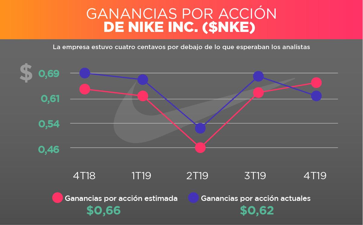 - La empresa ganó 62 centavos por acción, que estuvieron por debajo de los 66 centavos estimados. Los ingresos de la marca Nike aumentaron un +10% respecto al mismo trimestre del año pasado a $9.700M. Las ventas totales en América del Norte, aumentaron un +8% a $ 4.170M; las ventas en China aumentaron un +22% a $1.700M.
